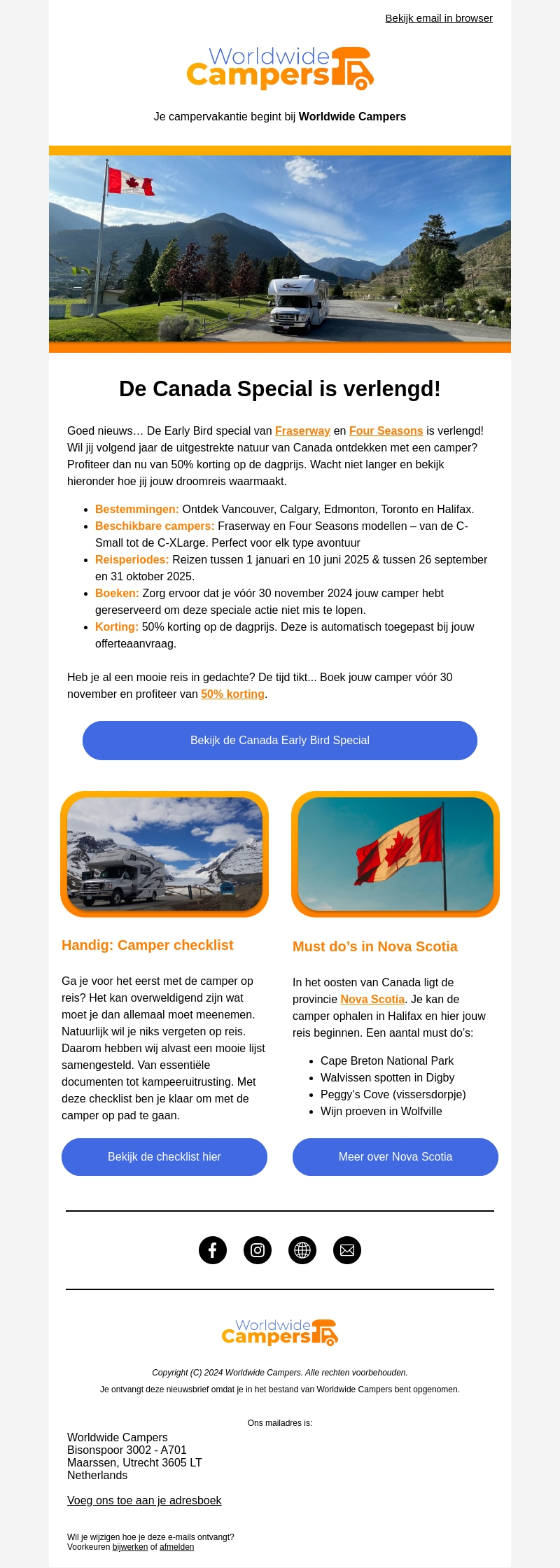 Goed nieuws! De Canada Early Bird special van Fraserway en Four Seasons is verlengd. Ontdek spectaculaire bestemmingen zoals Vancouver en Halifax. Reisperiode van januari tot oktober 2025. Reserveer je camper vóór 30 november voor deze geweldige deal. Geniet nu van 50% korting op de dagprijs!