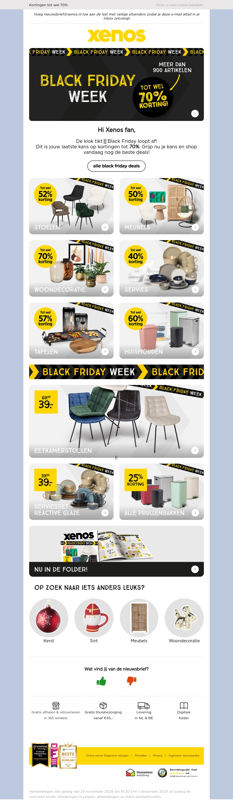 De laatste dag van Black Friday week bij Xenos biedt kortingen tot 70% op meer dan 900 artikelen. Van meubels tot woondecoratie, profiteer van enorme besparingen. Grijp je kans om nu de beste deals te scoren.