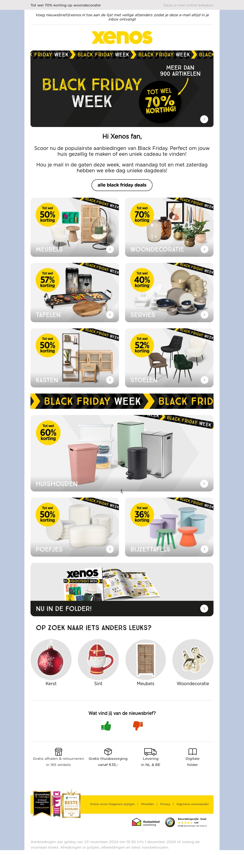 Bekijk de meest populaire Black Friday aanbiedingen bij Xenos. Met kortingen tot wel 70%, vind je alles om je huis gezellig te maken en unieke cadeaus te scoren. Of je nu op zoek bent naar meubels, woondecoratie, of servies, je vindt het allemaal hier. Mis deze geweldige deals niet en maak je klaar voor de feestdagen!