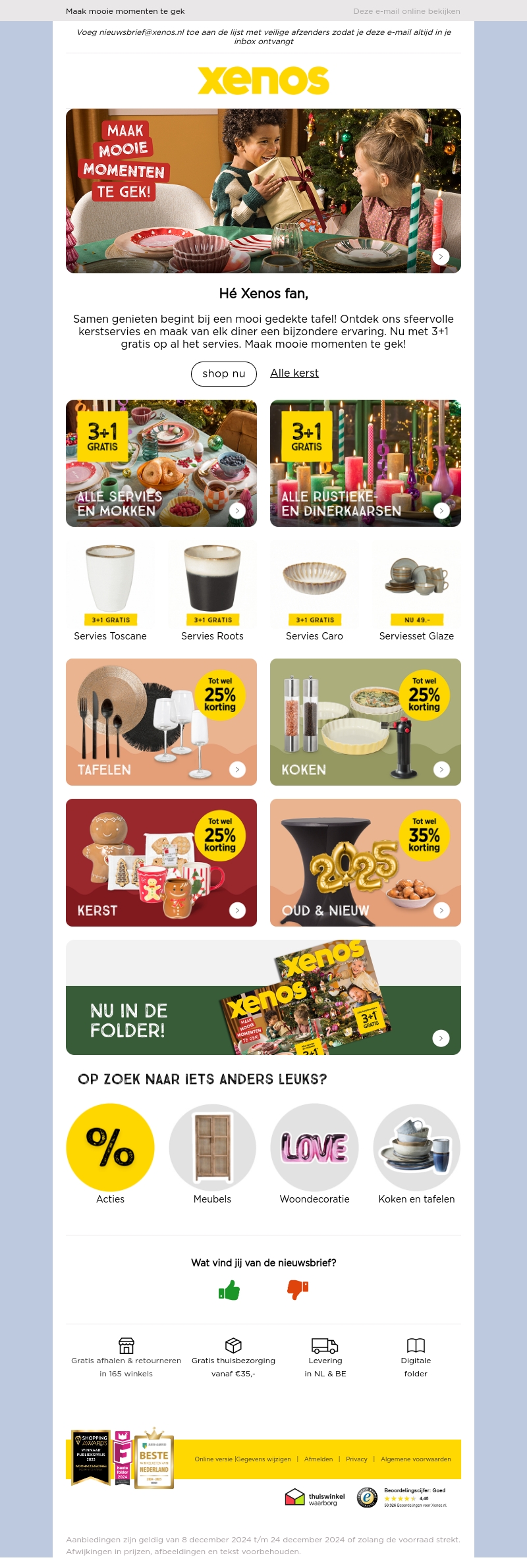 Vier de feestdagen met prachtig servies en mokken van Xenos. Profiteer van de 3+1 gratis actie en maak van elke maaltijd een bijzondere gelegenheid. Met deze aanbiedingen wordt samen genieten nog leuker. Haal het beste uit je kersttafel en ontdek ons uitgebreide assortiment. Shop nu en maak van de feestdagen een feestelijke ervaring.