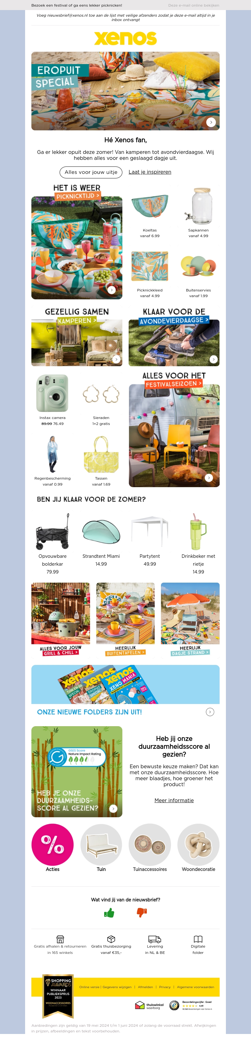 Ga er lekker op uit deze zomer met Xenos! Of je nu gaat kamperen, picknicken of een festival bezoekt, wij hebben alles wat je nodig hebt voor een geslaagd dagje uit. Van kampeerspullen tot avondvierdaagse benodigdheden en feestelijke accessoires. Laat je inspireren door onze nieuwste collectie en maak van elke gelegenheid een feestje!