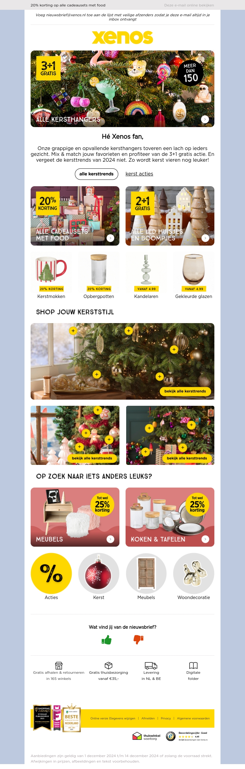 Xenos presenteert de nieuwste kersttrends van 2024, met unieke accessoires die een lach op ieders gezicht toveren. Mix & match jouw favorieten en profiteer van de 3+1 gratis actie. Vergeet niet de 20% korting op cadeausets met food en de aanbiedingen op kerstdecoraties.