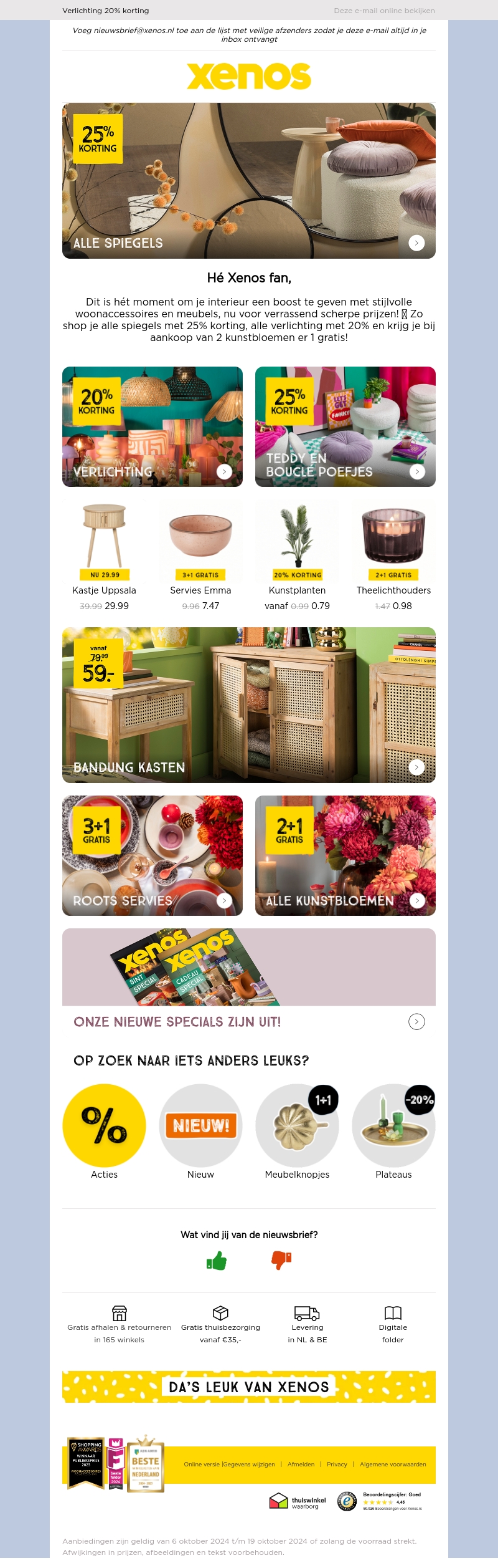 Dit is je moment om je interieur een boost te geven met stijl. Geniet van 25% korting op alle spiegels en 20% korting op verlichting. Ontdek ook speciale acties zoals 3+1 gratis op servies en 2+1 gratis op kunstplanten. Grijp nu je kans en verfraai je huis met onze scherpe aanbiedingen!