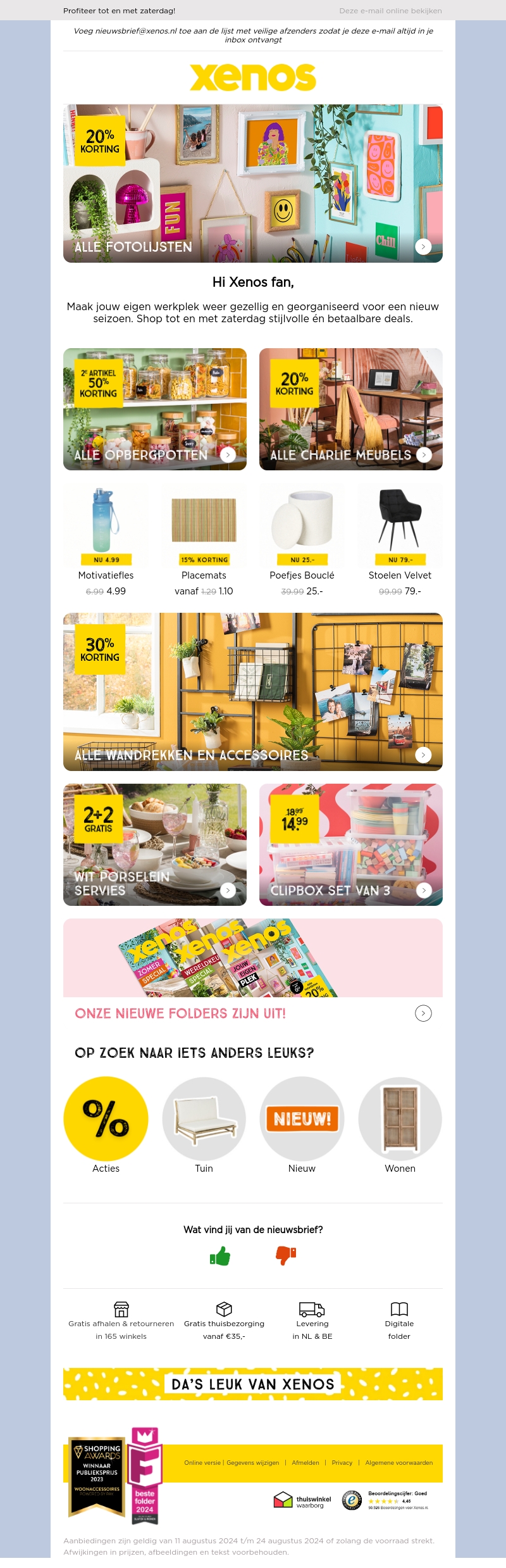 Maak jouw werkplek gezellig en georganiseerd met de nieuwste aanbiedingen van Xenos. Ontvang tot 20% korting op fotolijsten, opbergpotten, Charlie meubels en meer. Bekijk ook onze wandrekken met een korting van 30% en speciale aanbiedingen op wit porselein servies en clipbox sets. Shop nu en profiteer tot en met zaterdag.