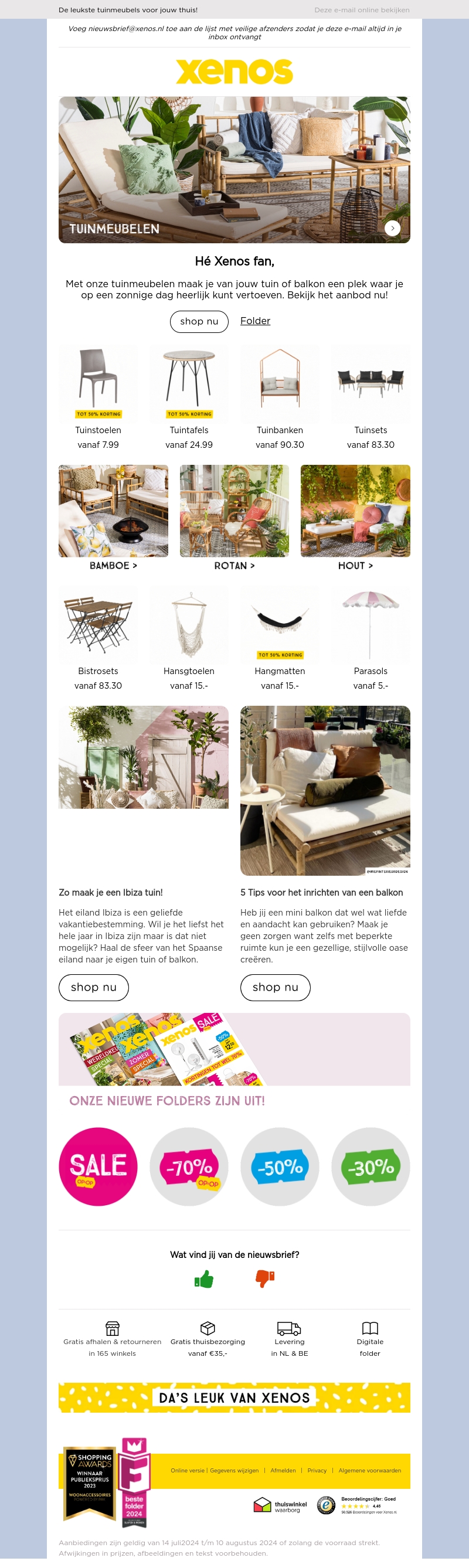Hé Xenos fan, met onze tuinmeubelen maak je van jouw tuin of balkon een plek waar je op een zonnige dag heerlijk kunt vertoeven. Bekijk het aanbod en creëer je eigen buitenparadijs! Van tuinstoelen en tuintafels tot bistrosets en hangmatten, we hebben alles wat je nodig hebt.