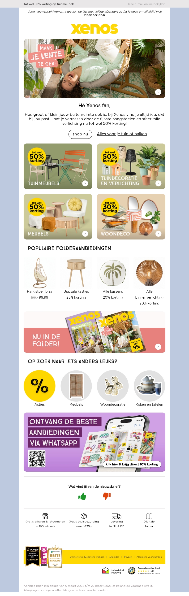 Maak je klaar voor de lente met Xenos! Profiteer van aantrekkelijke kortingen tot 50% op tuinmeubels, decoraties en verlichting. Laat je inspireren en creëer een sfeervolle buitenruimte met onze unieke items.
