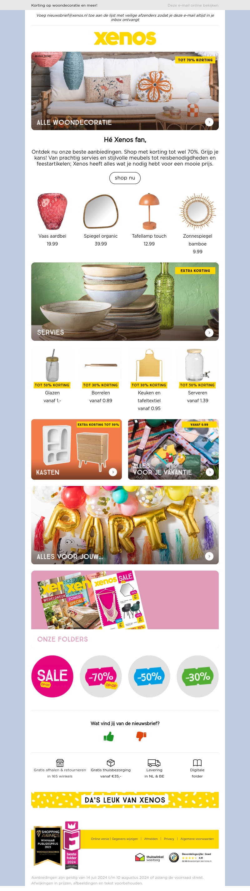 HÊ Xenos fan, ontdek nu onze beste aanbiedingen met kortingen tot 70%! Van prachtig servies en stijlvolle meubels tot reisbenodigdheden en feestartikelen. Grijp je kans en shop nu voordelig bij Xenos.
