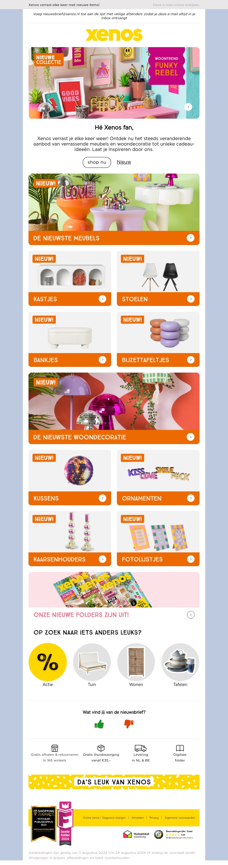 Hey Xenos fan! Laat je verrassen door ons steeds veranderende aanbod van meubels en woondecoratie. Ontdek nu de nieuwste kastjes, stoelen, bankjes, bijzettafeltjes, kussens, ornamenten, kaarshouders en fotolijstjes. Shop nu en laat je inspireren door onze unieke ideeën!
