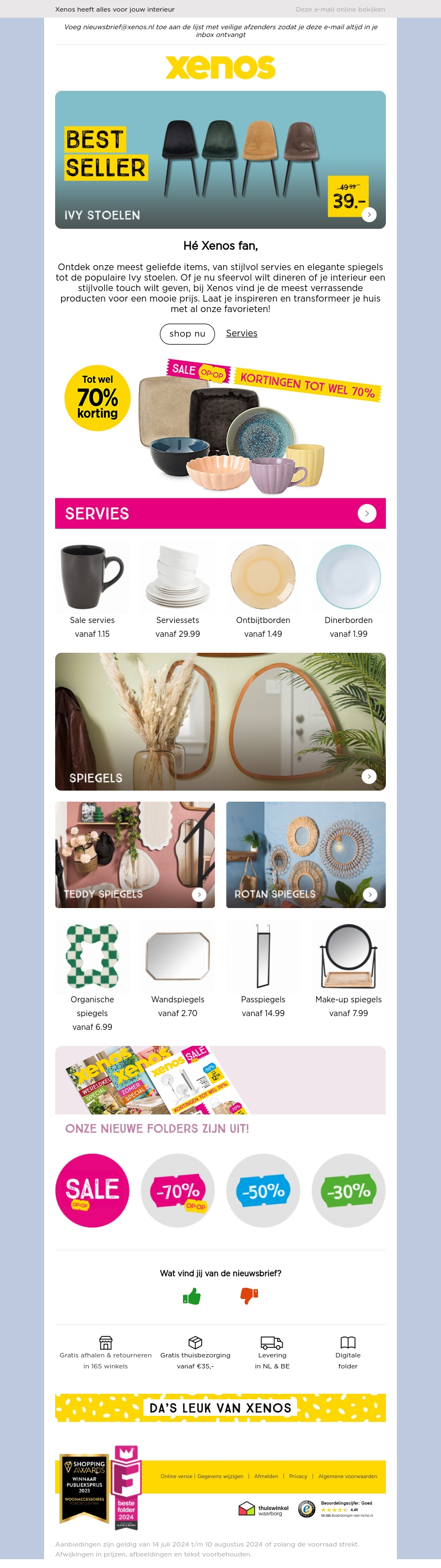 Ontdek de nieuwste bestsellers bij Xenos! Van trendy Ivy stoelen en stijlvol servies tot elegante spiegels - we hebben alles om jouw interieur een frisse look te geven. Geniet van kortingen tot wel 70% op een breed scala aan producten. Mis het niet en transformeer je huis met onze favoriete items.