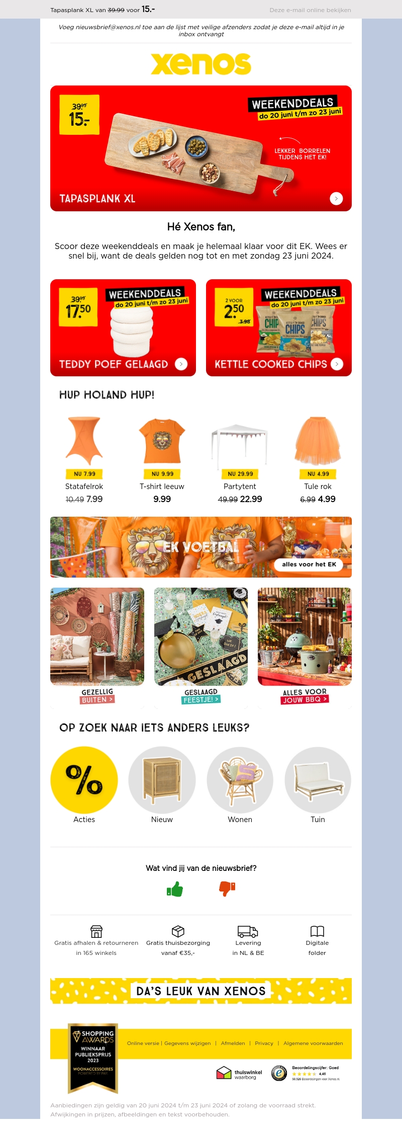 Hé Xenos fan, scoor snel de nieuwste EK weekenddeals en wees klaar voor dit EK. Van een tapasplank XL tot teddy poef en kettle cooked chips - mis het niet! De aanbiedingen zijn geldig tot zondag 23 juni 2024.
