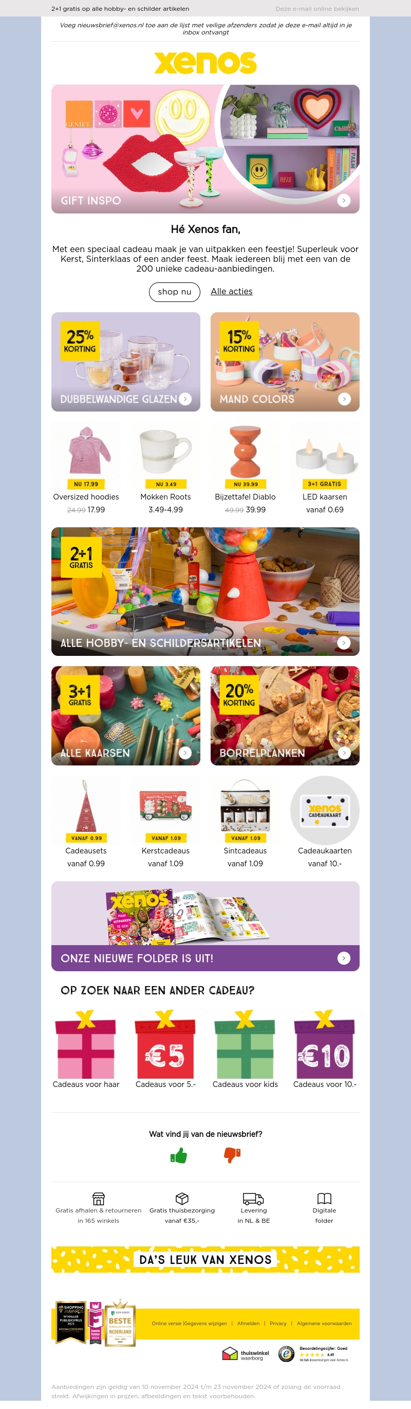 Geniet van een speciale selectie cadeaus bij Xenos, ideaal voor de feestdagen. Profiteer van unieke aanbiedingen zoals 2+1 gratis op hobbyartikelen en kortingen op dubbelwandige glazen. Ontdek ook de nieuwe folder voor meer inspiratie. Cadeaus zijn al verkrijgbaar vanaf 0.99 euro. Mis deze geweldige deals niet bij Xenos!