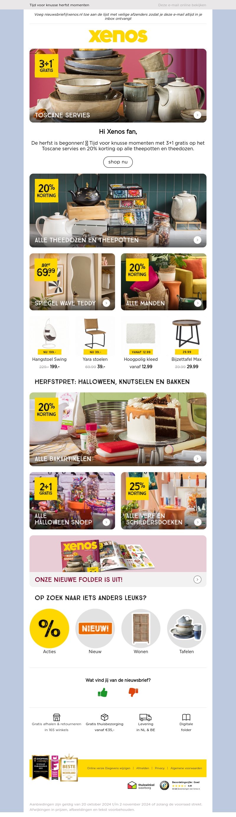 De herfst is aangebroken en Xenos viert dit met een speciale aanbieding: koop drie Toscane serviesstukken en krijg er één gratis! Er zijn ook kortingen op theeaccessoires en diverse woonartikelen. Geniet van knusse herfstmomenten en bereid je huis voor op het nieuwe seizoen met onze decoraties en aanbiedingen.