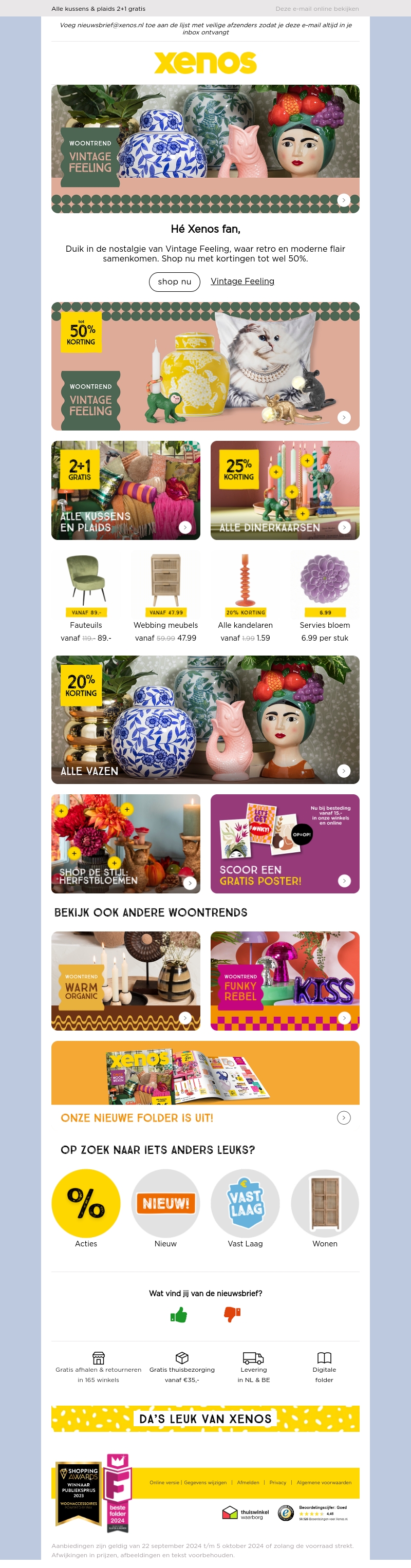 Hé Xenos fan, duik in de nostalgie van Vintage Feeling waar retro en moderne flair samenkomen. Profiteer van kortingen tot wel 50% op diverse woonaccessoires, meubels en meer. Bekijk ook andere woontrends zoals Warm Organic en Funky Rebel. Mis deze kans niet en verfraai je huis met stijl.