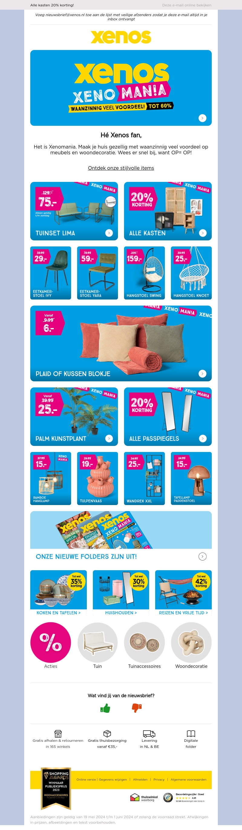 Hé Xenos fan, welkom bij Xenomaniac! Deze week profiteer je van waanzinnige aanbiedingen en kortingen tot 60% op meubels en woondecoratie. Mis het niet want OP=OP! Ontdek stijlvolle items zoals tuinsets, kasten, eetkamerstoelen en meer. Bekijk onze nieuwste folders voor extra deals en krijg gratis thuisbezorging vanaf €35.