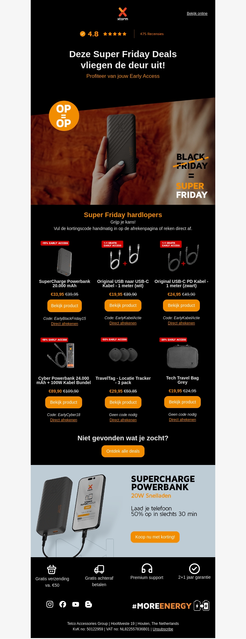 Profiteer van de geweldige Super Friday deals die snel de deur uitvliegen! Krijg vroege toegang tot exclusieve kortingen op populaire producten zoals de SuperCharge Powerbank en TravelTag trackers. Erg handig voor dagelijks gebruik en ideaal om cadeau te doen. Bestel snel voordat ze uitverkocht zijn. Bekijk alle aanbiedingen en bespaar groots! Gratis verzending vanaf β¬50.