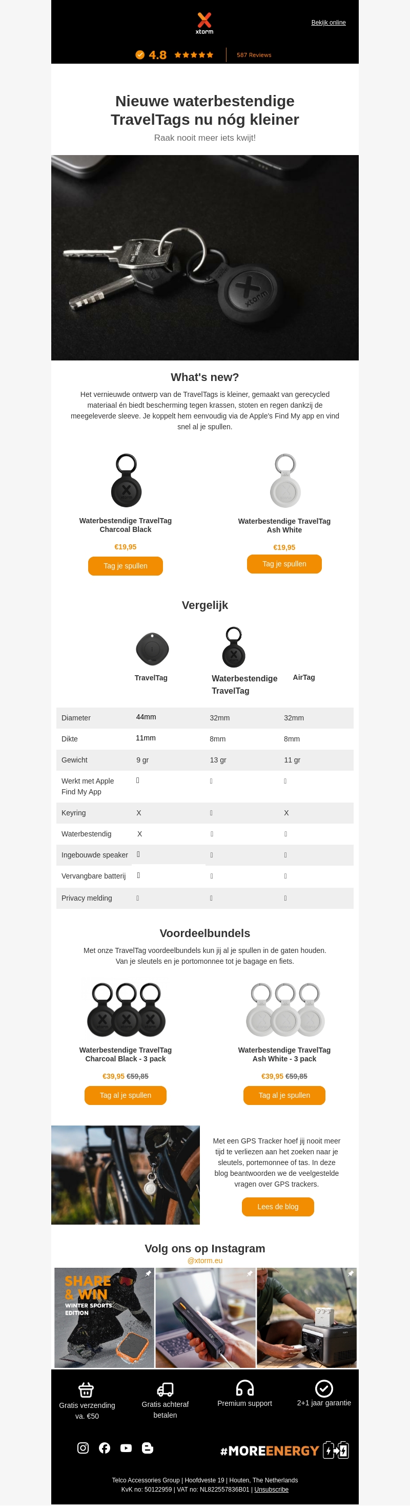 De nieuwe TravelTags van Xtorm zijn kleiner en waterbestendig, ideaal om al je spullen veilig te houden. Gemaakt van gerecycled materiaal, passen ze perfect bij je duurzame levensstijl. Met de Apple Find My app raak je nooit meer iets kwijt. Verkrijgbaar in Charcoal Black en Ash White voor €19,95.