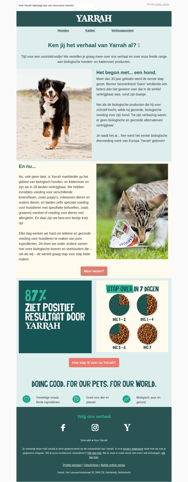 Yarrah is al meer dan 30 jaar marktleider in biologische honden- en kattenvoeding. Ontdek hoe Yarrah begon en hoe ze nu wereldwijd gezonde, biologische diervoeding aanbieden. Samen met boeren en veehouders maakt Yarrah van pure ingrediënten voedzaam voer voor je huisdier.