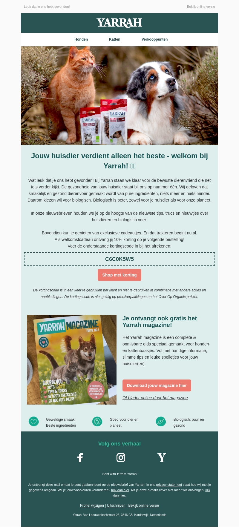 Yarrah presenteert gezonde en biologische producten voor je huisdier. Met pure ingrediënten zorgen wij voor de beste voeding. Abonneer je op onze nieuwsbrief en profiteer van 10% korting op je eerste bestelling. Ontvang ook het Yarrah magazine boordevol tips en leuke spelletjes voor jouw hond of kat.
