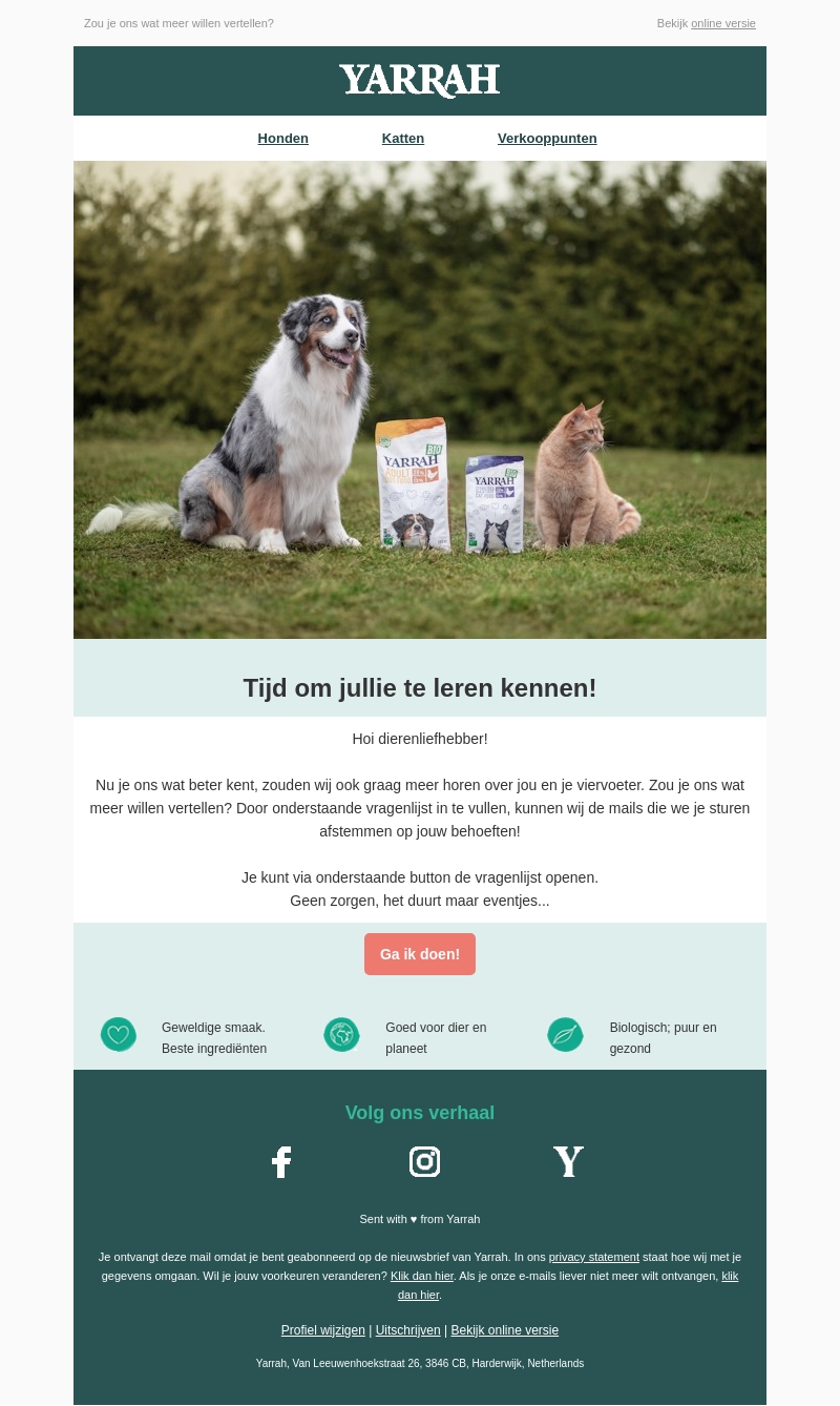 Beste dierenliefhebber, wij willen graag meer over jou en je huisdier weten! Vul de vragenlijst in en ontvang gepersonaliseerde e-mails afgestemd op jouw behoeften. Het kost maar een paar minuutjes!
