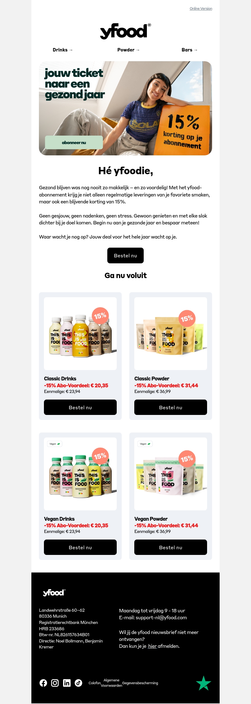 Blijf gezond en bespaar met Yfood! Met een Yfood-abonnement krijg je niet alleen je favoriete producten, maar ook een vaste korting van 15%. Geniet van gemak zonder gedoe en begin direct aan jouw gezonde transformatie.