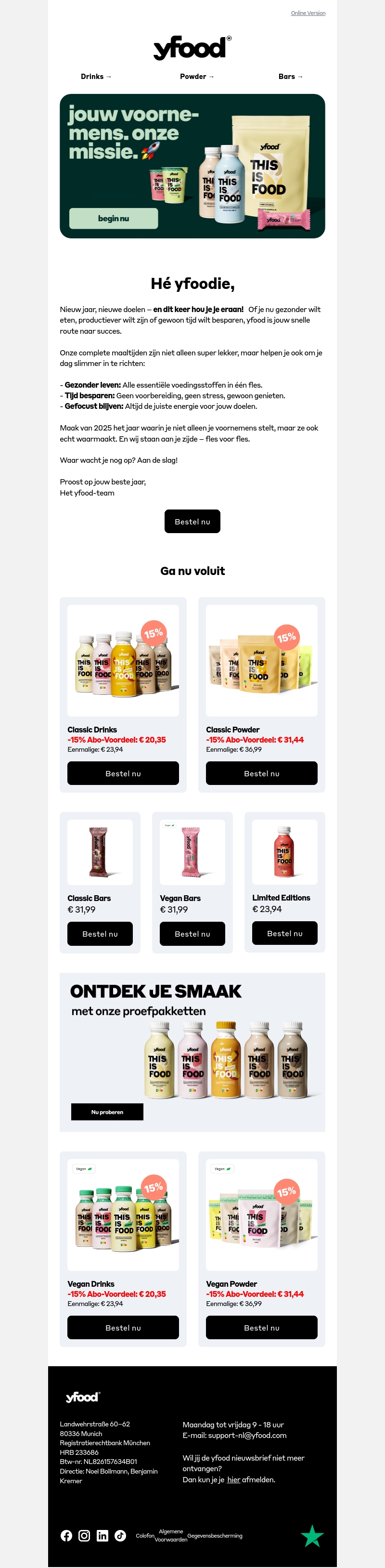 Nieuw jaar, nieuwe doelen met yfood! Of je nu tijd wilt besparen of gezond wilt eten, yfood staat voor je klaar. Geniet van smakelijke maaltijden die je helpen je doelen te bereiken. Proost op een succesvol 2025 met yfood.