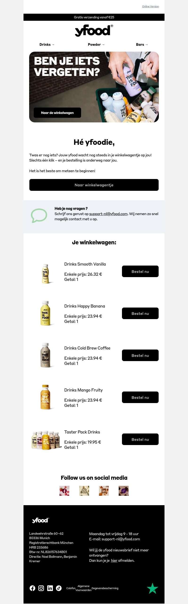 Heb je iets in je Yfood winkelwagen laten liggen? Geen zorgen, je kunt je favoriete producten snel en eenvoudig bestellen. Klik op 'Naar winkelwagentje' en je bestelling is onderweg. Ontdek populaire smaken zoals Smooth Vanilla en Happy Banana. Je kunt contact opnemen met de klantenservice voor vragen.