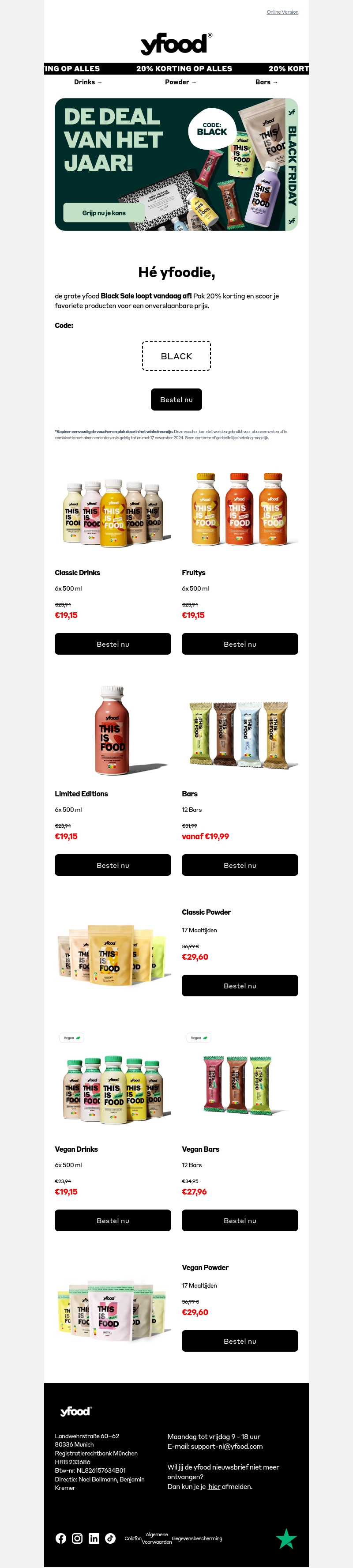 Mis de YFood Black Sale niet! Vandaag krijg je 20% korting op alle producten. Of je nu kiest voor drinks, powder of bars, je profiteert van een geweldige aanbieding. Gebruik de code BLACK en bestel direct. De voorraad is beperkt, dus wees er snel bij.