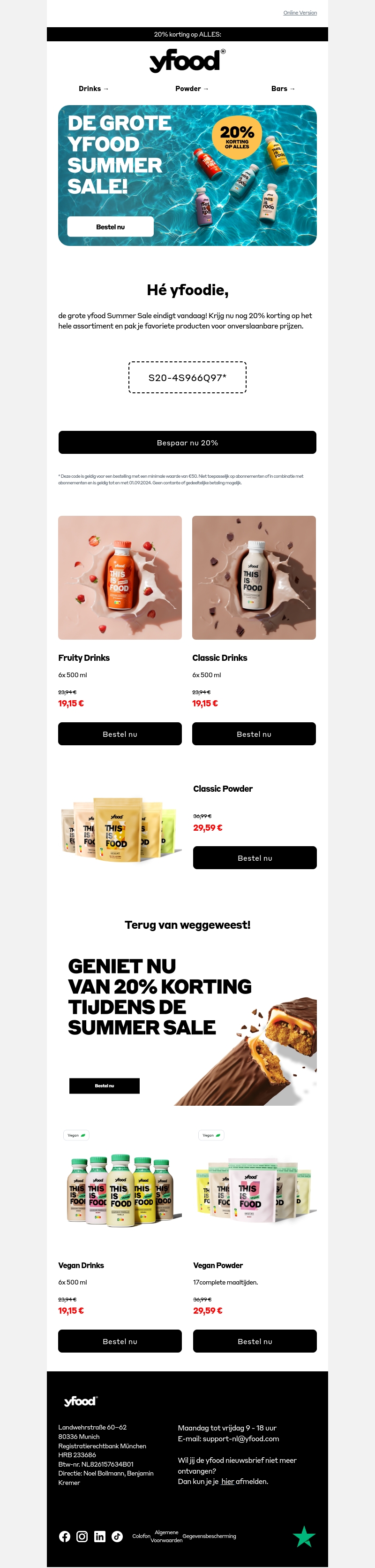 De grote YFood Summer Sale eindigt vandaag! Pak nog snel 20% korting op je favoriete YFood producten voordat de sale voorbij is. Ontdek heerlijke fruity drinks, classic drinks, poeder en meer voor ongeëvenaarde prijzen.