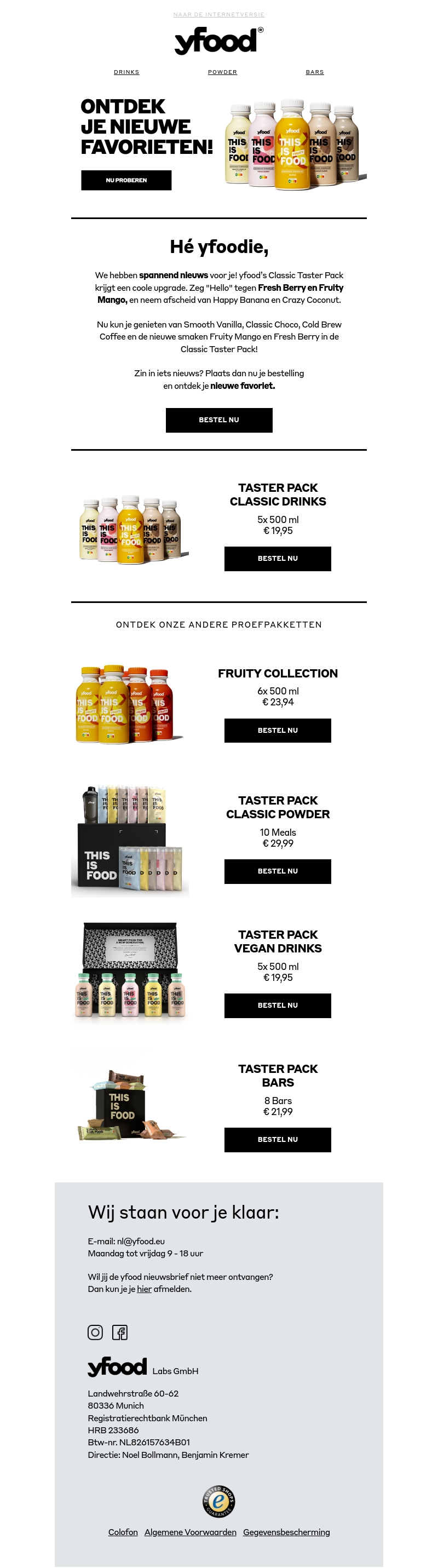 We hebben spannend nieuws! yfood's Classic Taster Pack krijgt een upgrade met Fresh Berry en Fruity Mango! Ontdek ook onze andere proefpakketten voor meer heerlijke smaken. Bestel nu en probeer je nieuwe favorieten.