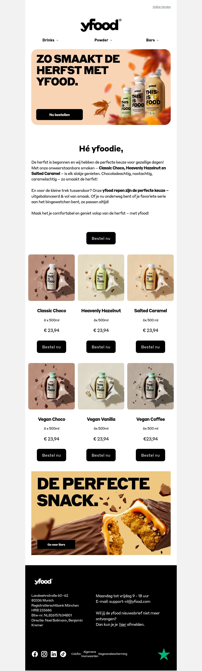De herfst is begonnen en wij hebben de perfecte keuze voor gezellige dagen. Ontdek onze onweerstaanbare smaken β Classic Choco, Heavenly Hazelnut en Salted Caramel. Vergeet ook niet onze yfood repen, perfect voor tussendoor. Comfort en smaak gegarandeerd!