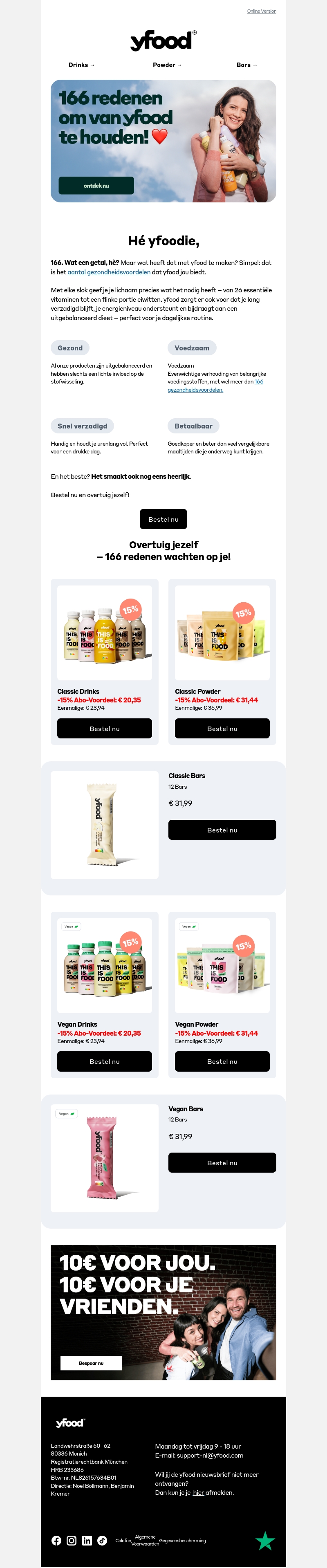 In deze nieuwsbrief ontdekt u de 166 redenen om van yfood te houden. yfood biedt essentiΓ«le voedingsstoffen voor uw lichaam, met gemak en betaalbaarheid in elk product. Perfect voor een drukke dag, terwijl u geniet van smaakvolle opties. Profiteer nu van 15% korting op verschillende producten en ontdek de voordelen.