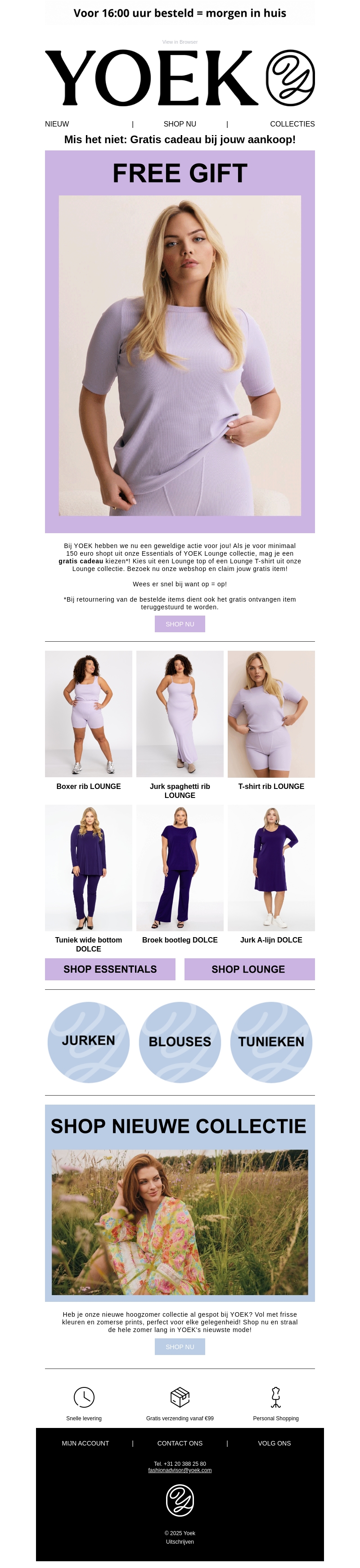 Bij Yoek ontvang je nu een gratis cadeau bij je bestelling! Bij een minimale besteding van €50 aan de Essentials of Lounge collectie, krijg je een gratis T-shirt. Perfect om je garderobe een zomerse update te geven. Geniet van snelle levering en gratis verzending vanaf €39. Wees er snel bij en claim je cadeau!