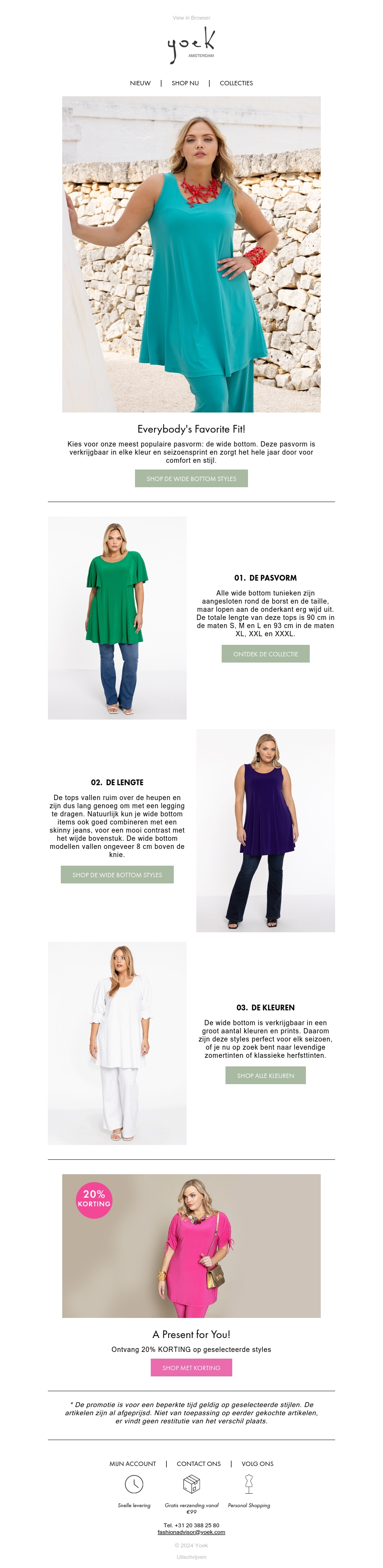 Kies voor onze meest populaire pasvorm: de wide bottom. Deze tops vallen ruim over de heupen en zijn perfect te combineren met verschillende stijlen broeken. Verkrijgbaar in diverse kleuren en prints, ze zijn een must-have voor zowel zomerse als herfstachtige dagen.