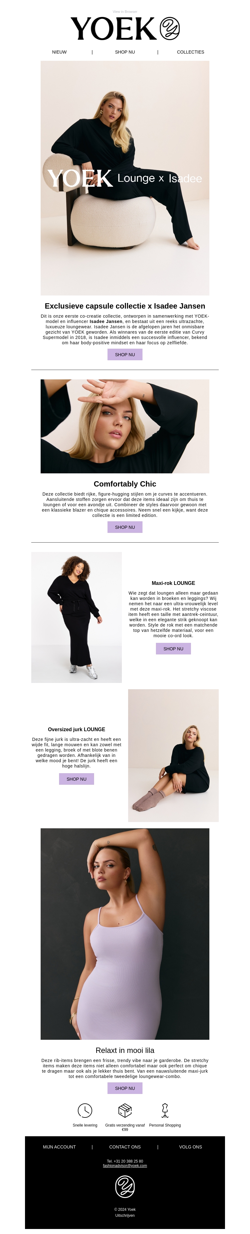 Ontdek de exclusieve Yoek Lounge x Isadee collectie. Deze collectie brengt stijlvolle, comfortabele stukken ontworpen voor elke vrouw. Van luxe loungemode tot chique rib-items in modieuze tinten. Perfect om je kledingkast te upgraden voor het nieuwe seizoen. Bekijk de collectie nu voor een tijdloze, elegante look.
