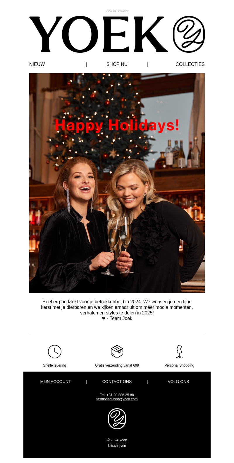 Yoek bedankt je voor je betrokkenheid in 2024 en wenst je fijne feestdagen. Ze zien uit naar meer mooie momenten en fashion in 2025. Verras jezelf en je dierbaren met stijlvolle kerstcadeaus van Yoek.