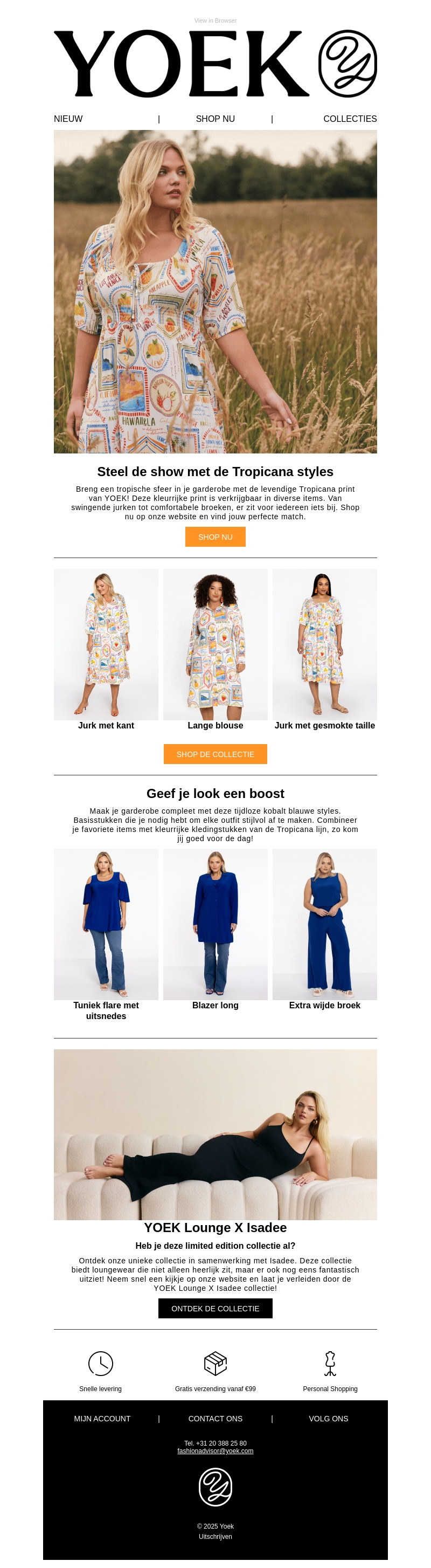 Breng een vleugje tropen in je kledingkast met de Tropicana styles van YOEK. Deze levendige prints zijn verkrijgbaar in verschillende items zoals jurken, blouses en broeken. Voeg kleur en stijl toe aan je garderobe met comfortabele en opvallende stukken. Bekijk ook de nieuwe YOEK Lounge X Isadee collectie voor stijlvolle loungewear. Shop nu om je zomerlook compleet te maken.