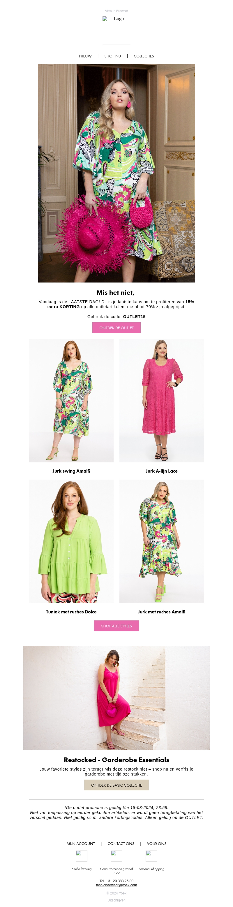 Vandaag is de laatste dag om te profiteren van 15% extra korting op alle outletartikelen. Met kortingen tot wel 70% is dit jouw kans om je garderobe voordelig aan te vullen. Gebruik de code OUTLET15 voor extra voordeel. Ontdek stijlvolle jurken en blouses in onze outlet collectie. Shop nu en mis deze kans niet.
