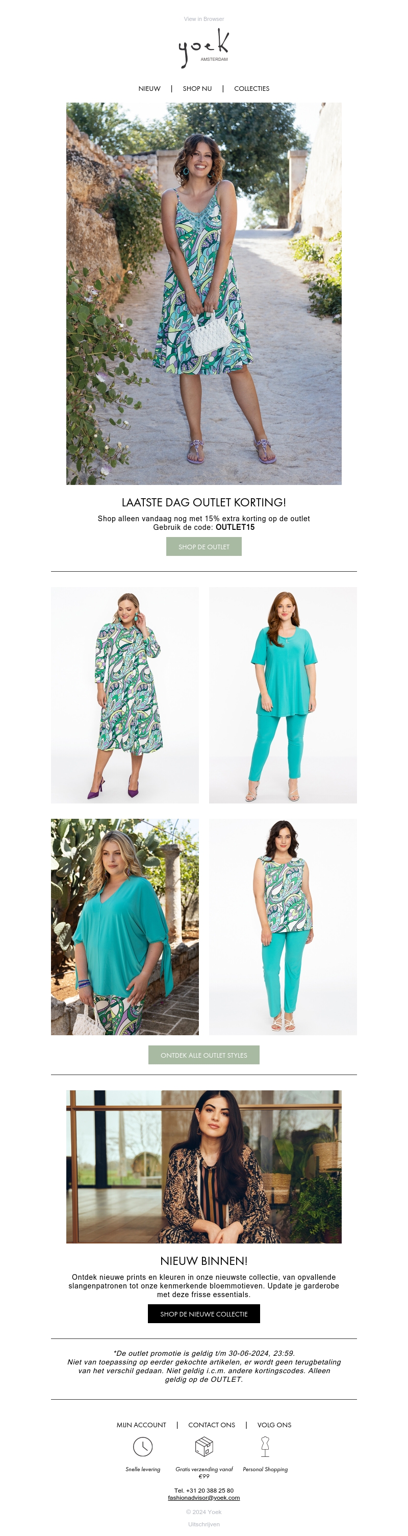 Het is de laatste dag om te profiteren van 15% extra korting op onze outletcollectie. Gebruik de code OUTLET15 bij het afrekenen en ontdek een breed scala aan stijlvolle mode-items. Mis deze kans niet om je garderobe aan te vullen met prachtige stukken tegen gereduceerde prijzen.