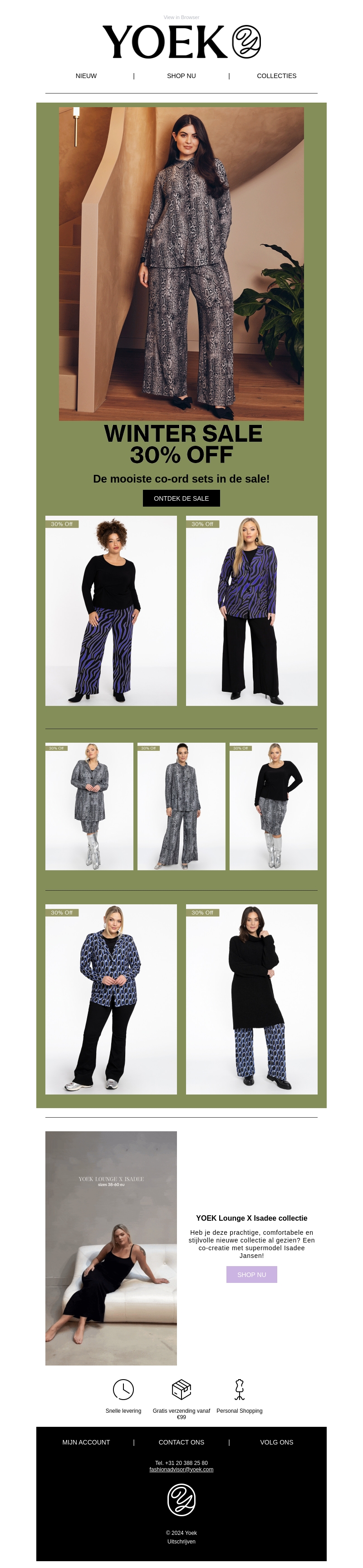 Grijp je kans in de grote Winter Sale bij Yoek! Profiteer van 30% korting op prachtige co-ord sets, perfect voor elk seizoen. Van elegante prints tot stijlvolle pasvormen, er is voor ieder wat wils. Ontdek nu onze nieuwe Lounge X Isadee collectie voor ultiem comfort en stijl. Mis deze kans niet en shop je favoriete looks vandaag nog. Klik snel op 'Ontdek de Sale'!