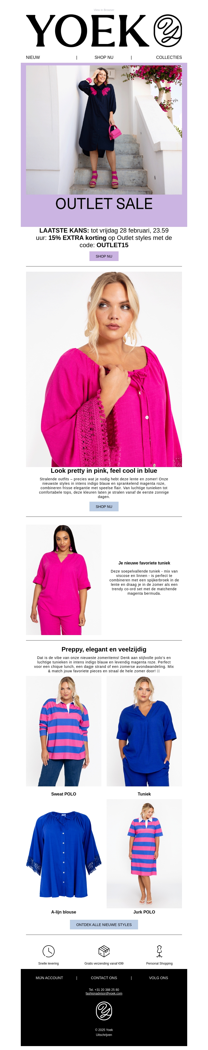 Profiteer van de laatste kans op extra korting in onze outlet sale! Met de code OUTLET15 ontvang je 15% extra korting op geselecteerde stijlen. Ontdek stijlvolle tunieken en blouses in frisse kleuren voor het nieuwe seizoen. Shop nu en verfris je garderobe met onze elegant en veelzijdige collectie.
