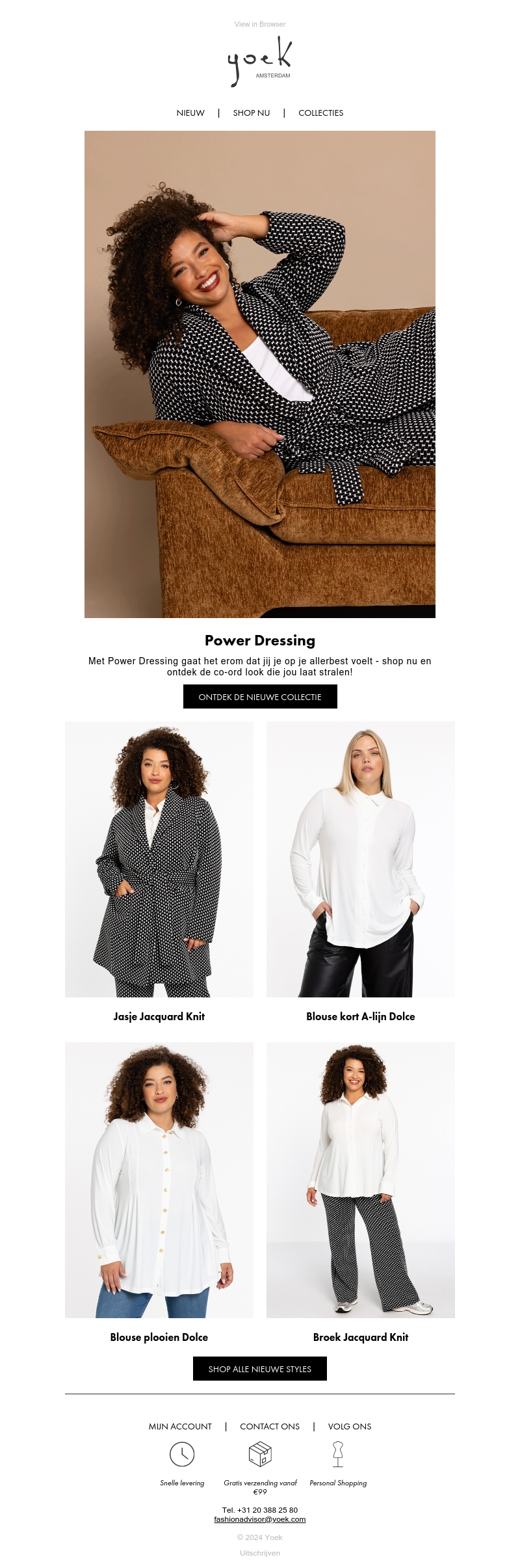 Met Power Dressing gaat het erom dat jij je op je allerbest voelt. Shop nu bij Yoek en ontdek de looks die jou laten stralen! Bekijk onze nieuwste co-ord collecties en vind de perfecte outfit voor elke gelegenheid. Gratis verzending vanaf €99!