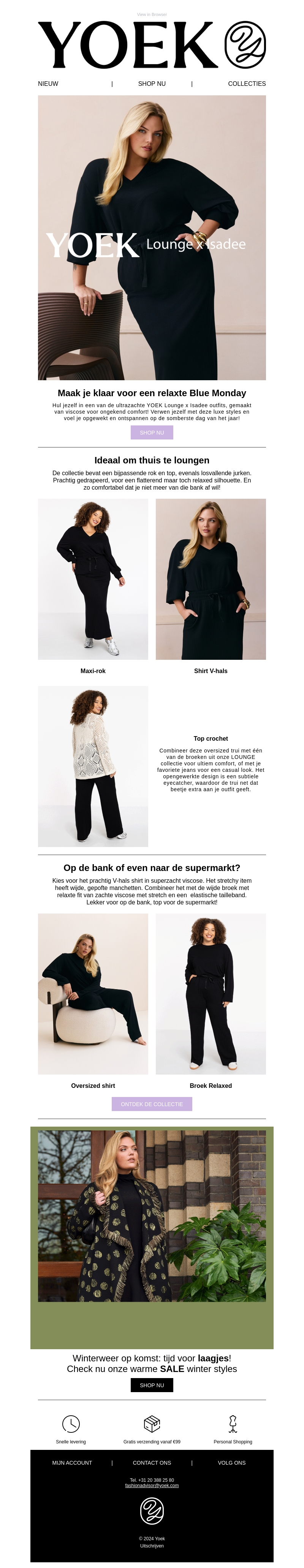 Maak je klaar voor een relaxte Blue Monday met de Yoek Lounge x Isadee collectie. Deze lijn biedt comfortabele outfits, perfect voor een ontspannen dag. Geniet van luxe viscose en mooie pasvormen die zorgen voor een stijlvolle uitstraling. Ideaal voor thuis loungen of boodschappen doen. Ontdek de veelzijdige items, van maxi-rokken tot oversized shirts.