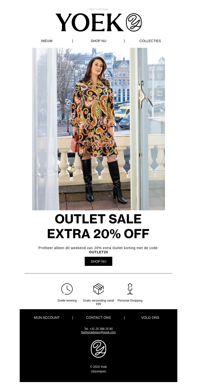 Geniet dit weekend van exclusieve kortingen bij de Yoek Outlet! Profiteer van extra 20% korting op de outletselectie. Ontdek onweerstaanbare deals op modieuze kleding. Gebruik de kortingscode en upgrade je garderobe met stijlvol design. Mis deze kans niet en shop je favoriete items.