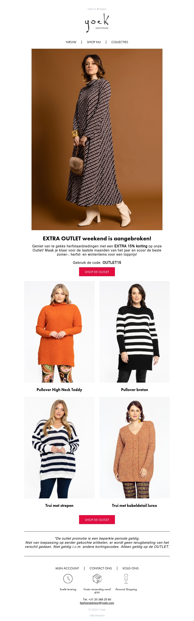 Geniet van een geweldig herfstaanbod met extra 15% korting op de Outlet bij Yoek. Bereid je voor op het nieuwe seizoen met stijlvolle mode voor een topprijs. Gebruik de code OUTLET15.