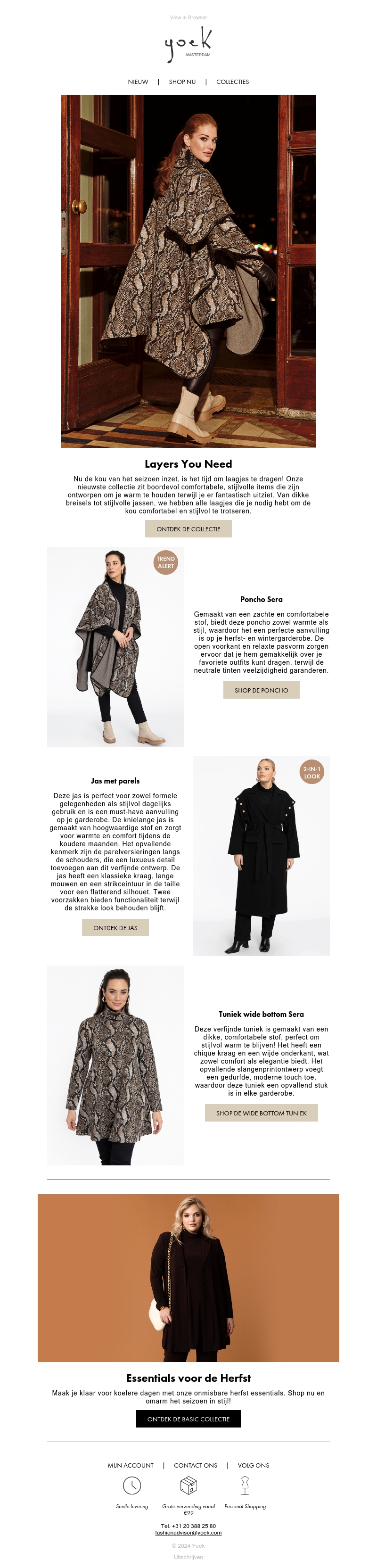 Bereid je voor op de herfst met onze nieuwste collectie stijlvolle lagen. Van comfortabele poncho's tot elegante jassen, wij hebben alles wat je nodig hebt om stijlvol en warm te blijven. Ontdek de veelzijdigheid van onze items en geef je garderobe een upgrade. Shop nu en maak je klaar voor de koelere dagen.