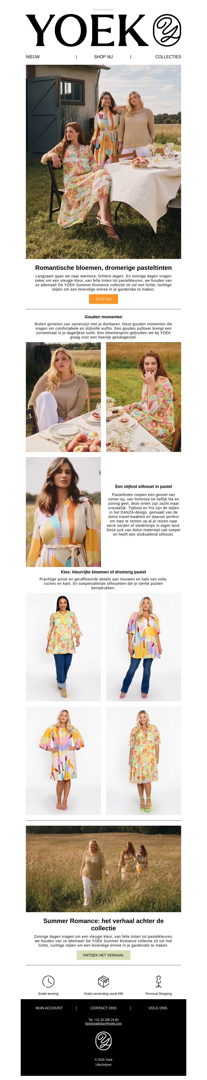 Verwelkom de lente met Yoek's nieuwste collecties. Deze nieuwsbrief brengt je de frisse en levendige ontwerpen vol romige bloemen en zachte pasteltinten. Ontdek stijlvolle silhouetten en lichte outfits die perfect zijn voor zonnige dagen. Laat je inspireren door de combinatie van comfort en elegantie, speciaal ontworpen voor een lente vol kleur. Shop nu en creëer een garderobe die je sterke punten benadrukt.