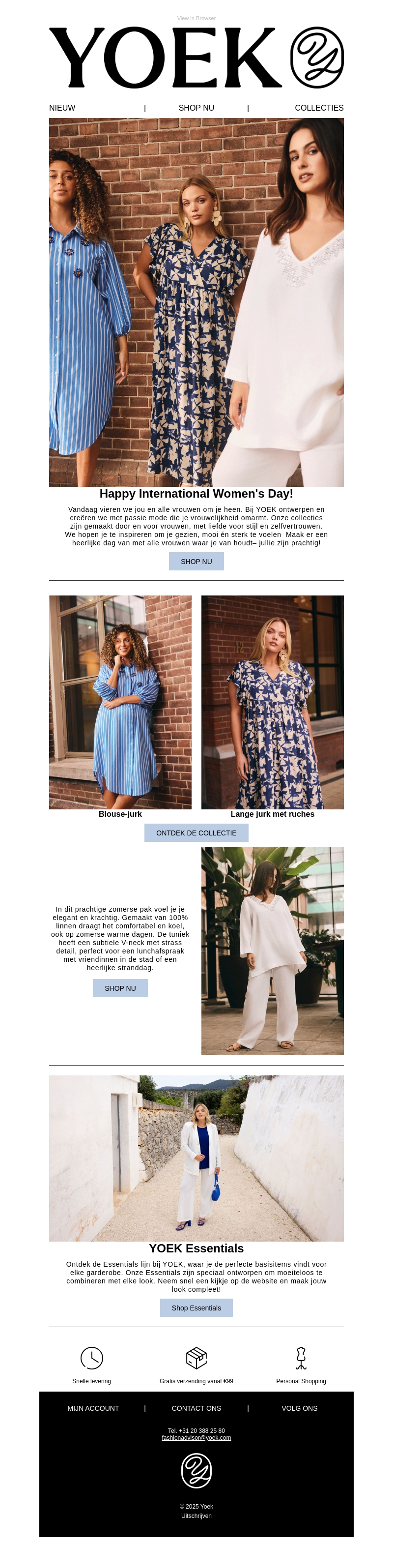 Yoek viert Internationale Vrouwendag met passievolle mode die vrouwelijkheid viert. Onze collecties zijn speciaal ontworpen voor en door vrouwen. Laat je inspireren door de mooiste zomeroutfits en ontdek de Yoek Essentials voor een complete look.