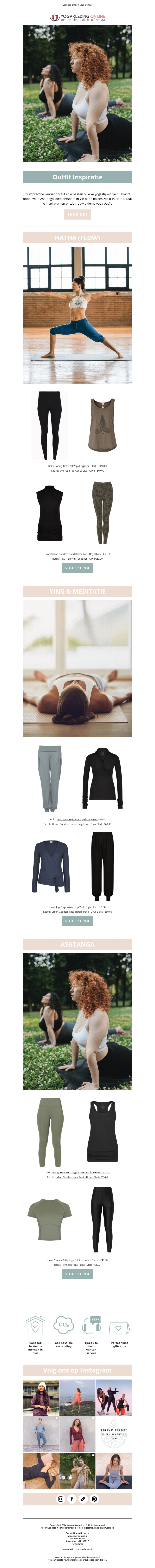 Verken nieuwe yogastijlen met onze inspirerende outfitselectie. Of je nu aan Hatha, Yin of Ashtanga doet, wij hebben de kleding die perfect bij jouw practice past. Ontdek de balans tussen stijl en comfort met onze geselecteerde items. Bekijken en winkel nu om je yogaspirit te verhogen. Maak je klaar voor de ultieme ontspanning en expressie. Mis deze kans niet om je kledingkast te vernieuwen!