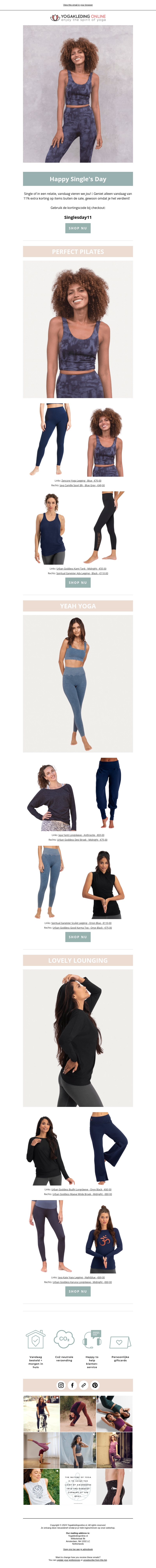 Deze Single's Day vieren we met een fantastische extra korting van 11% op al je favoriete yoga- en loungekleding. Of je nu aan het mediteren bent of lekker thuis aan het relaxen, onze kleding is perfect voor elke gelegenheid. Mis deze kans niet om jezelf te verwennen met de beste outfits voor een ongelooflijke prijs.