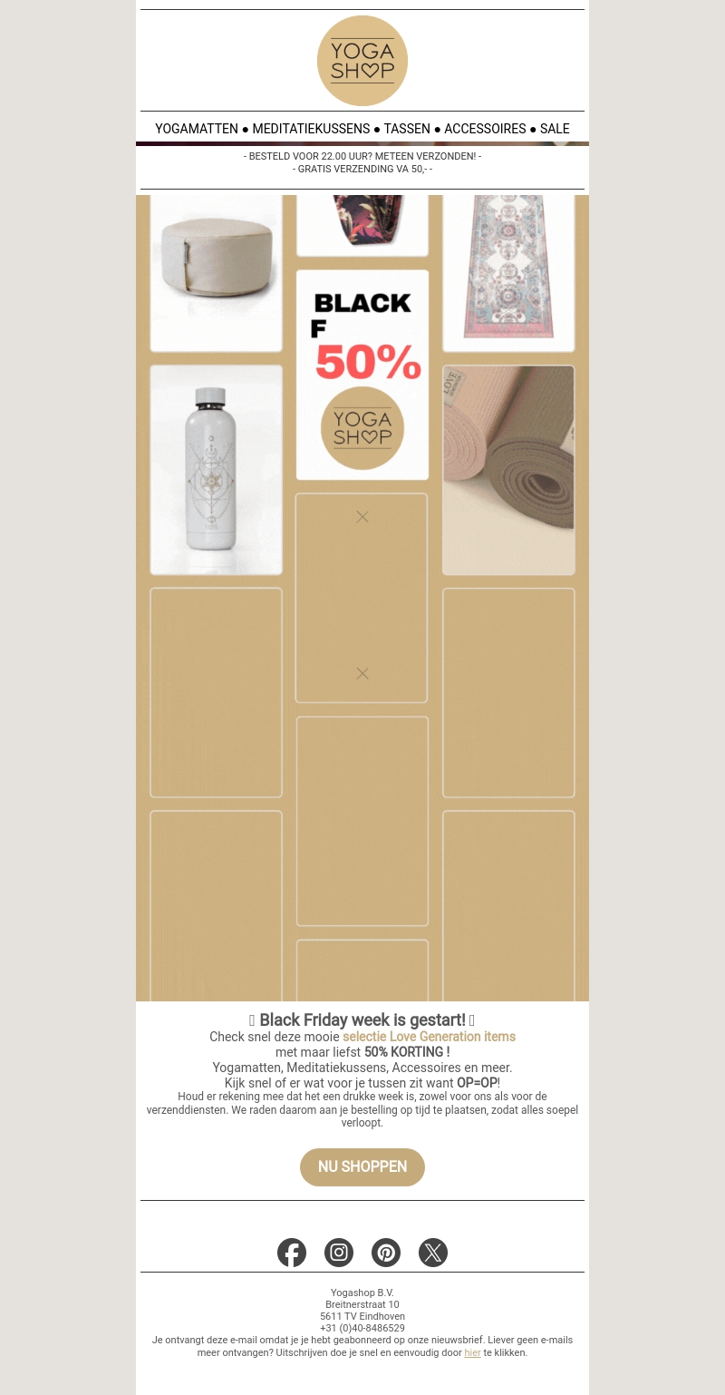 YogaShop viert Black Friday met spectaculaire kortingen op een breed scala aan producten. Ontvang tot wel 50% korting op geselecteerde Love Generation items zoals yogamatten, meditatiekussens en accessoires. Mis deze geweldige kans niet om je favoriete producten met korting te bemachtigen. Shop gemakkelijk online en profiteer van de snelle verzending. Deze week is het druk, dus bestel op tijd!